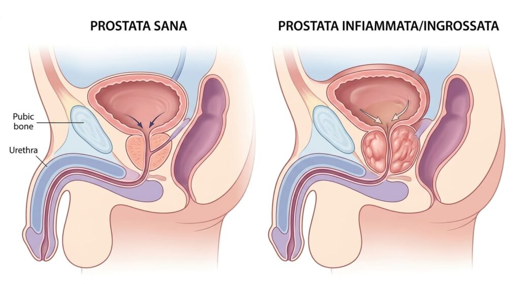 La prostata è una ghiandola piccola come una castagna, ma la sua posizione è cruciale: circonda l’uretra, il condotto che trasporta l’urina fuori dal corpo. Quando la prostata si infiamma (prostatite) o aumenta di volume, accade qualcosa di molto simile a un ingorgo stradale.